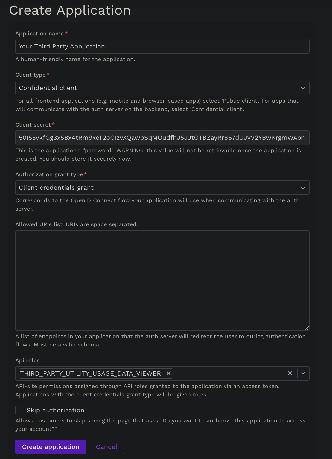 THIRD_PARTY_UTILITY_USAGE_DATA_VIEWERas the API Role. - Leave the skip authorization checkbox unchecked.